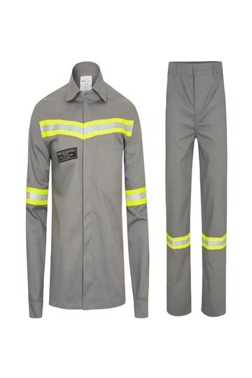 Obs: Antes de finalizar a compra, verificar o tamanho mais adequado na tabela de medidas e imagens no anuncio. Conjunto de Roupa Anti-Chamas NR-10 para proteção contra arco elétrico e fogo repentino, composto por camisa manga longa e calça. C.A - 48511 - CAMISA Camisa com abertura frontal , botões anti chama e pala protetora. Punho com carcela e botão, Faixa refletiva, com bolso frontal . Proteção de risco 2, contra fogo repentino e arco elétrico . Camisa de segurança confeccionada em uma camada de tecido Uniforte Pro FR, 100% algodão , ATPV11 Cal/cm2. ATPV 9,1 Cal/ cm2 ATPV 11 Cal /cm2 C A - 48513 - CALÇA Proteção risco 2, contra arco elétrico e fogo repentino. Tecido 100% algodão , 270 G/M 2, retardante á chama . Calça de segurança , confeccionada em uma camada de tecido Uniforte Pro FR. Com fechamento botão retardante á chama , cós traseiro elástico de 40 mm , 2 bolsos frontais e 2 bolsos traseiros , com faixa refletiva .