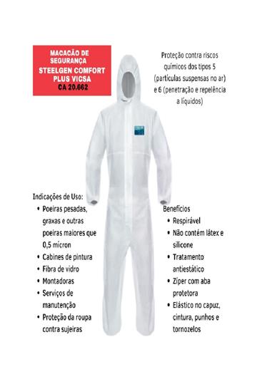 Macacão de Segurança Antiestático em Polipropileno â VIC-85.111 CA 20.662 STEELGEN VICSA - Tipo 6. Macacão de segurança, confeccionado em não tecido de fibra de polipropileno microporoso respirável, elástico no capuz, cintura, punhos e tornozelos. Possui tratamento antiestático. Benefícios: Não contém látex e silicone; Tratamento antiestático; Elástico no capuz, cintura, punhos e tornozelos. Aplicações: Proteção do tronco, membros superiores e inferiores Poeiras secas e úmidas maiores que 0,5 mícron Laboratórios farmacêuticos, cabines de pintura, fibra de vidro, montadoras, serviços de manutenção e limpeza em geral Proteção da roupa contra sujeiras RECOMENDADO PARA: * Cabines de pintura * Trabalhos com Alumina * Negro de fumo * Carvoaria * Cimentaria * Montadoras * Serviços de Manutenção e limpeza em geral VANTAGENS E BENEFÍCIOS Alta relação custo-benefício, alta estabilidade dimensional, não perde suas características em ambientes úmidos, respirável, excelente resistência a ruptura por flexão (ISO 854 - Método B), não contém látex e silicone em sua composição. RESULTADO NORMAS TÉCNICAS Macacão testado no IPT - Instituto de Pesquisas Tecnológicas. Norma ISO 16602:2007 (riscos químicos) Aprovado para proteção do tronco, membros superiores e membros inferiores do usuário contra riscos de origem química* onde: Penetração a Líquidos: Ácido Sulfúrico 30% - nível 3; Hidróxido de Sódio 10% - nível 3; Butanol - nível 3; o-Xileno - nível 3. Repelência a Líquidos: Ácido Sulfúrico 30% - nível 3; Hidróxido de Sódio 10% - nível 3; Butanol - nível 3; o-Xileno - nível 2. Nota: os resultados variam de O a 3, sendo 3 0 melhor resultado. Proteção limitada contra produtos químicos líquidos. Resistência ao rasgamento trapezoidal: Nível 2 Nota: os resultados variam de 1 a 6, sendo 6 o melhor resultado. DURABILIDADE / VIDA ÚTIL Indeterminado. A durabilidade ou vida útil do macacão depende de vários fatores que envolvem o tipo de atividade como, tempo e frequência de uso, material manipulado, tipo de atividade ou tarefa realizada, cuidados do usuário, a observação dos requisitos de instruções de uso e conservação, entre outros. Diante destas variáveis a definição a vida útil do macacão somente será possível após a realização de testes práticos no local de trabalho. O tempo de durabilidade ou vida útil sempre será uma média dos resultados obtidos nos testes. O macacão de segurança deve ser substituído quando estiver danificado Nota: os limites máximos de resistência e utilização do macacão estabelecidos nos ensaios (testes) devem ser respeitados. Cor: Branco Código: VIC-85.111